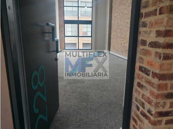 La oficina consta de un espacio integral a doble altura, con cocineta con lavaplatos y mueble multiusos, salón para oficinas, para 5 ó 6 puestos de trabajo, alfombrada tráfico pesado, cuenta con canaletas para cableado, y tiene buena iluminación natural y cuenta con bombillos. Está ubicada en el segundo piso.