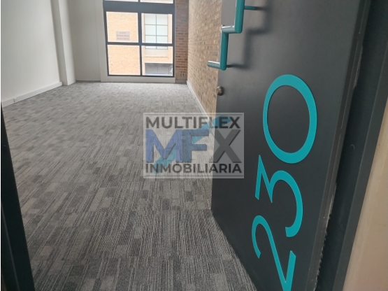 La oficina consta de un espacio integral a doble altura, con cocineta con lavaplatos y mueble multiusos, salón para oficinas, para 5 ó 6 puestos de trabajo, alfombrada tráfico pesado, cuenta con canaletas para cableado, y tiene buena iluminación natural y cuenta con bombillos. Está ubicada en el segundo piso.